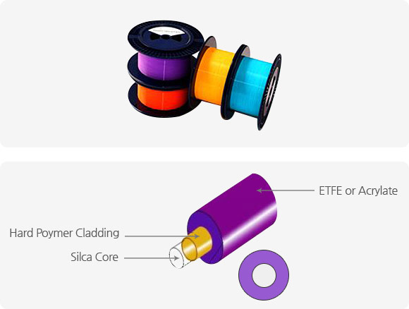 특히, 하드 폴리머 클래딩 섬유(HPCF)는 일반 광섬유에 비해 높은 장력 강도와 수분 저항력을 지니므로 통신, 산업, 근적외선 분광학 등 다양한 분야에서 널리 이용되고 있습니다. 200um~600um의 대구경은 데이터 링크와 커넥터간의 높은 결합성을 제공합니다.